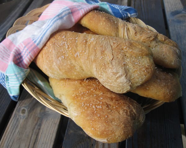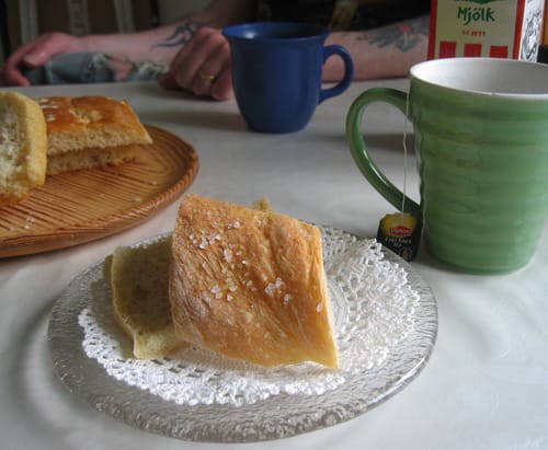 Tag sedan försiktigt upp degen och dela den i 4 bitar. Forma till baguetter, pensla med vatten och strö över flingsalt. Gör ev snitt med kniv i baguetterna. Jäs 1 timme till. Grädda 5 minuter i 240 grader, sänk sedan ugnen till 200 grader och grädda 25 minuter till. Spraya lite vatten in i ugnen efter ca 15 minuter för mer krispig yta. Sen är det bara att äta! Varm baguette med smältande smör på – och te, mmmmmmmmmmm…