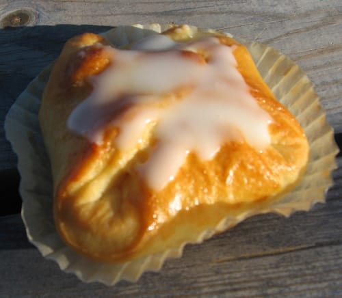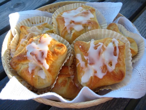 Smula jästen i en bunke. Strö över lite av sockret (hjälpen jästen att smälta). Tillsätt mjölken och rör tills jästen är upplöst. Tillsätt smöret, delat i mindre bitar, socker och mjöl. Arbeta snabbt ihop till en smidig deg. Kavla ut den till en stor fyrkant, 40 x 40 cm på mjölad bakbänk. Skär i fyrkanter 8 x 8 cm. Blanda ihop ingredienserna till fyllningen och klicka lite mitt på varje fyrkant. Vik upp de fyra hörnen på degbitarna och lägg i pappersformar. Ställ på plåt och låt jäsa ca 2 timmar. Pensla med uppvispat ägg och grädda sedan i 250 grader 5 – 8 minuter. Låt kallna. Blanda glasyr av en msk vatten eller citronsaft och 1 – 2 dl florsocker. Garnera de kalla bullarna med glasyren.