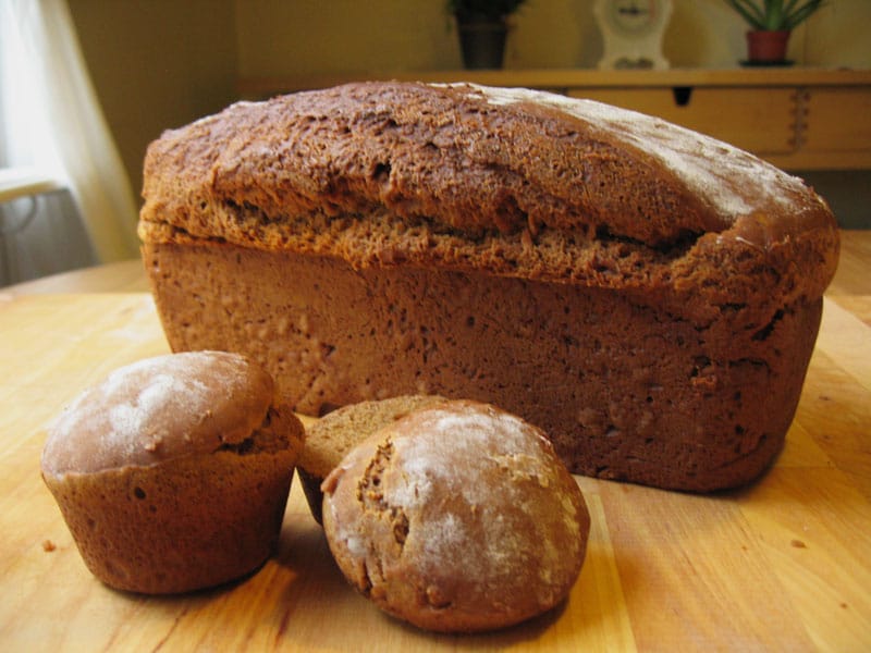 Blanda samman allt i en stor bunke. Tryck ut degen i en stor långpanna eller fördela i tre limpformar. Grädda först brödet 60 minuter i 100 grader. Öka sedan temperaturen till 150 grader och grädda en timme till. Låt stå 15 minuter på eftervärme. Stjälp upp på bakduk när brödet svalnat och skär i 3 limpor om stor långpanna använts.