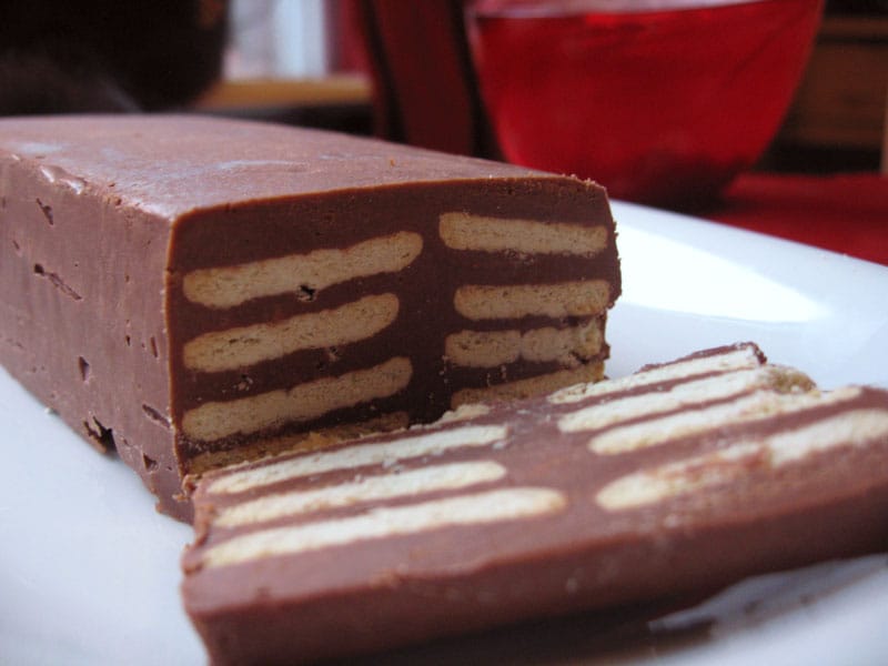 Smält kokosfett och choklad på svag värme i en kastrull. Vispa ägg och socker pösigt. Rör försiktigt ner den ljumma choklad/kokosfettblandningen i äggsmeten. Klä en avlång form, ca 1,5 liter, med bakplåtspapper. Bred ut ett tunt lager chokladsmet i botten. Sedan ett lager kex, fortsätt tills smeten är slut – avsluta med chokladsmet överst. Låt formen stå i kylskåp över natten. Skär i tunna skivor vid servering.