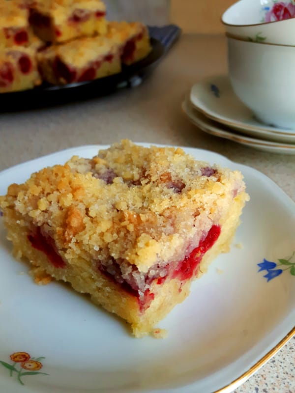 Linda skriver om sitt recept: ”Gudomligt goda och mjuka hallonrutor med frasiga smulor på toppen. Hela kakan görs av samma deg vilket gör den enkel att göra.”