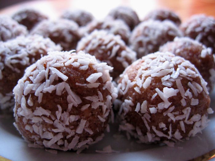 Mixa 2 dl sötmandel med 0.5 dl kokosflingor, 1 tsk vaniljsocker, 3 tsk kanel och drygt 1 tsk kardemumma. Hacka 8 torkade, urkärnade dadlar i mindre bitar och låt dem göra kokos, kryddor och mandel sällskap i mixern. Sist tillsätts 2 msk kokosolja (går även bra med smör om man vill ha det). Rulla bollarna i kokosflingor.