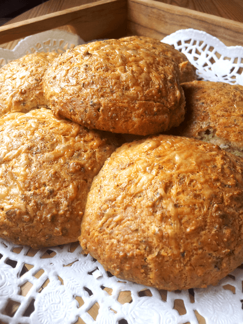 Sätt ugnen på 200 grader. Blanda alla torra ingredienser. Rör sedan ner ägg, crème fraiche och smör. Arbeta till en jämn smet. Låt stå i fem minuter. Klicka ut på en plåt med bakplåtspapper. Om man vill vara noga blir det ca 50 gram smet per bröd. Placera bullarna ganska tätt så de gräddas ihop i ugnen. Strö över osten. Grädda ca 25 min i nedre delen av ugnen.