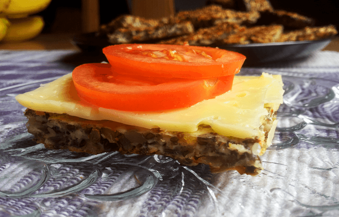 Sätt ugnen på 225 grader och klä en ugnsform ca 25 x 30 cm med bakplåtspapper. Vispa äggen fluffiga. Blanda i keso och ost. Blanda alla övriga ingredienser noga innan även de tillsätts. Blanda ordentligt. Låt stå fem minuter. Häll ut i formen i ett jämnt lager (ska vara ca 1 cm tjockt). Grädda ca 20 minuter mitt i ugnen. Låt svalna och skär i rutor. Om man vill ha portionsbröd kan man använda en välsmord muffinsform. Klicka en knapp matsked i varje hål. Jämna till, ska även här vara ca 1 cm tjockt. Grädda något kortare tid än helformen. Titta till dem så att de inte bränner.