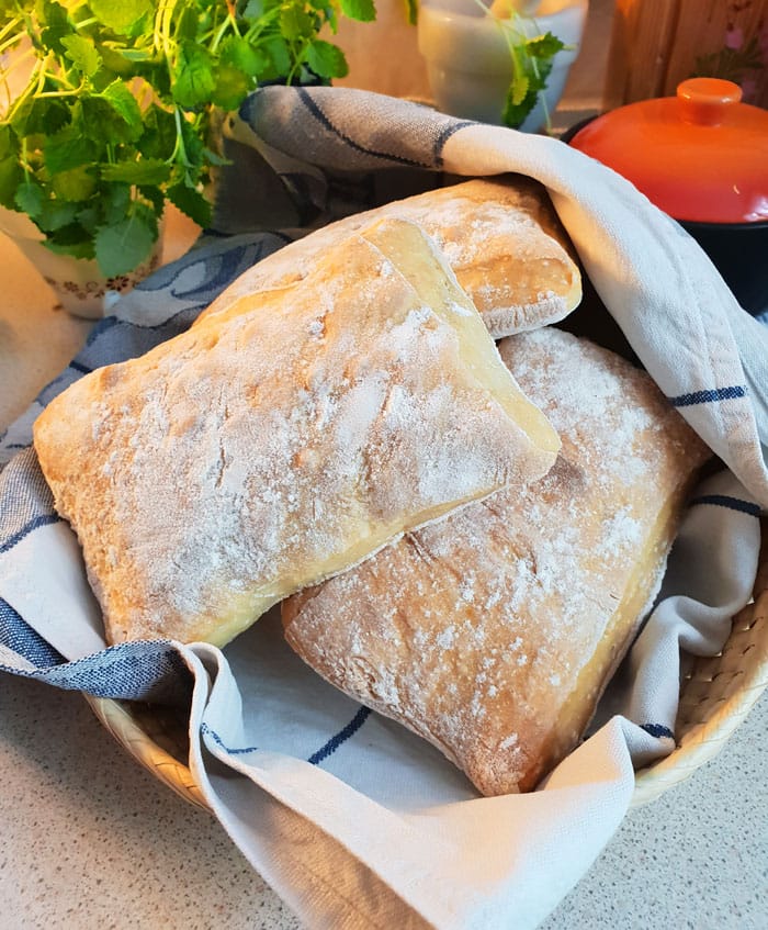 Det är ju så gott med Chiabatta! Men hittills har jag inte lyckats få till dem hemma. Men nu har jag hittat det ultimata receptet i Allers. Det tog typ 2 minuter att sätta degen. Sedan 3 minuter att baka ut. En enda lång jäsning. Så jag satte degen på kvällen. Och medan ugnen blev varm bakade jag ut bröden. Sedan 25 minuter i ugnen. Och ”voilá!” – nybakat frukostbröd. Älskar sådana här recept 🙂